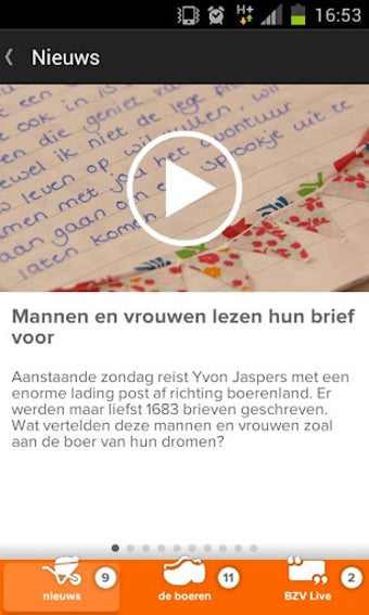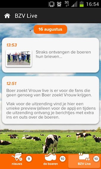 Ben je een keertje niet thuis op zondagavond? Niet getreurd. De app heeft namelijk de functie 'Boer zoekt vrouw live'. Ongeveer elke 3 minuten wordt in tekst bijgehouden wat er gebeurt tijdens de aflevering, soms aangevuld met een video. Zit je in de trein of bus, dan hoef je dus niets te missen van Yvon Jaspers en haar boeren.